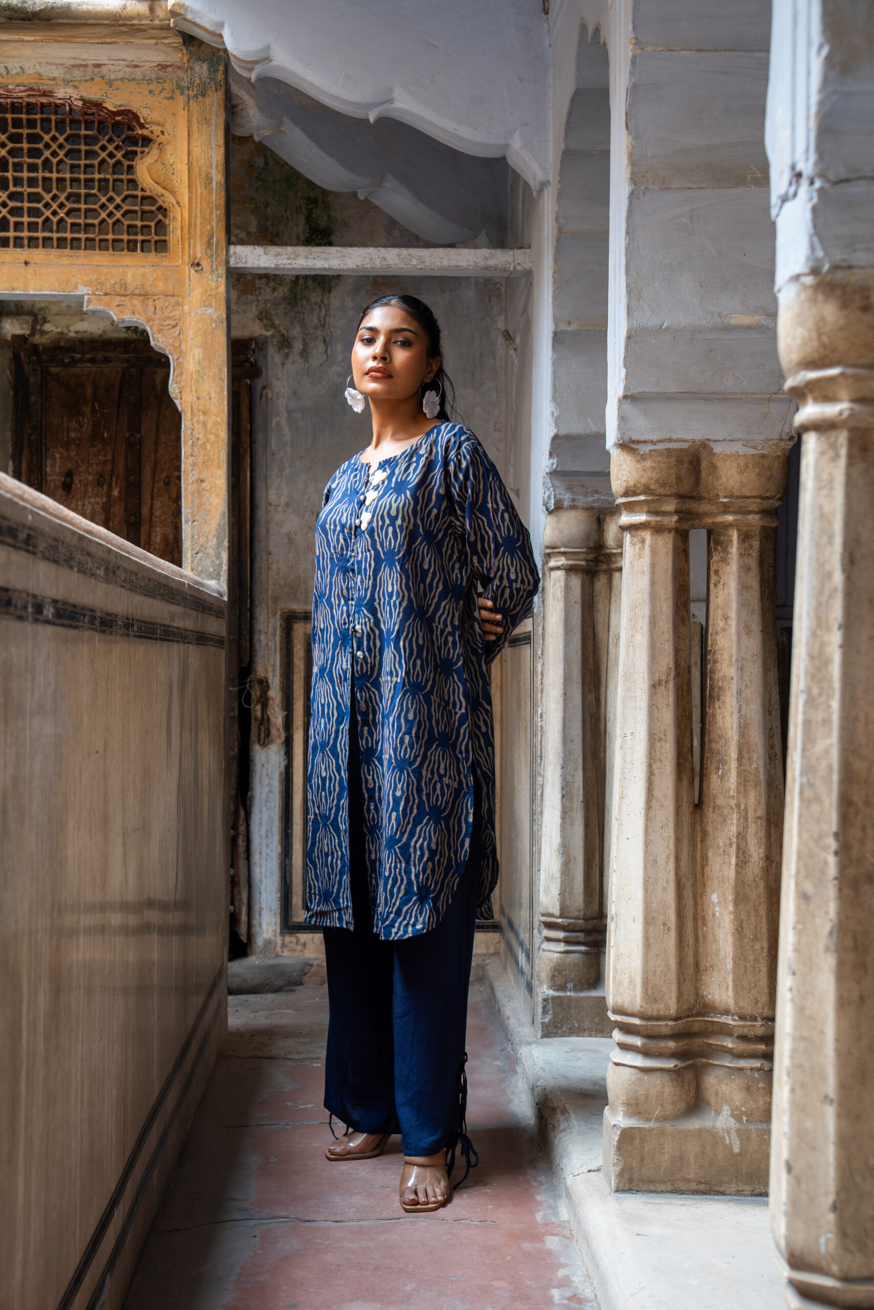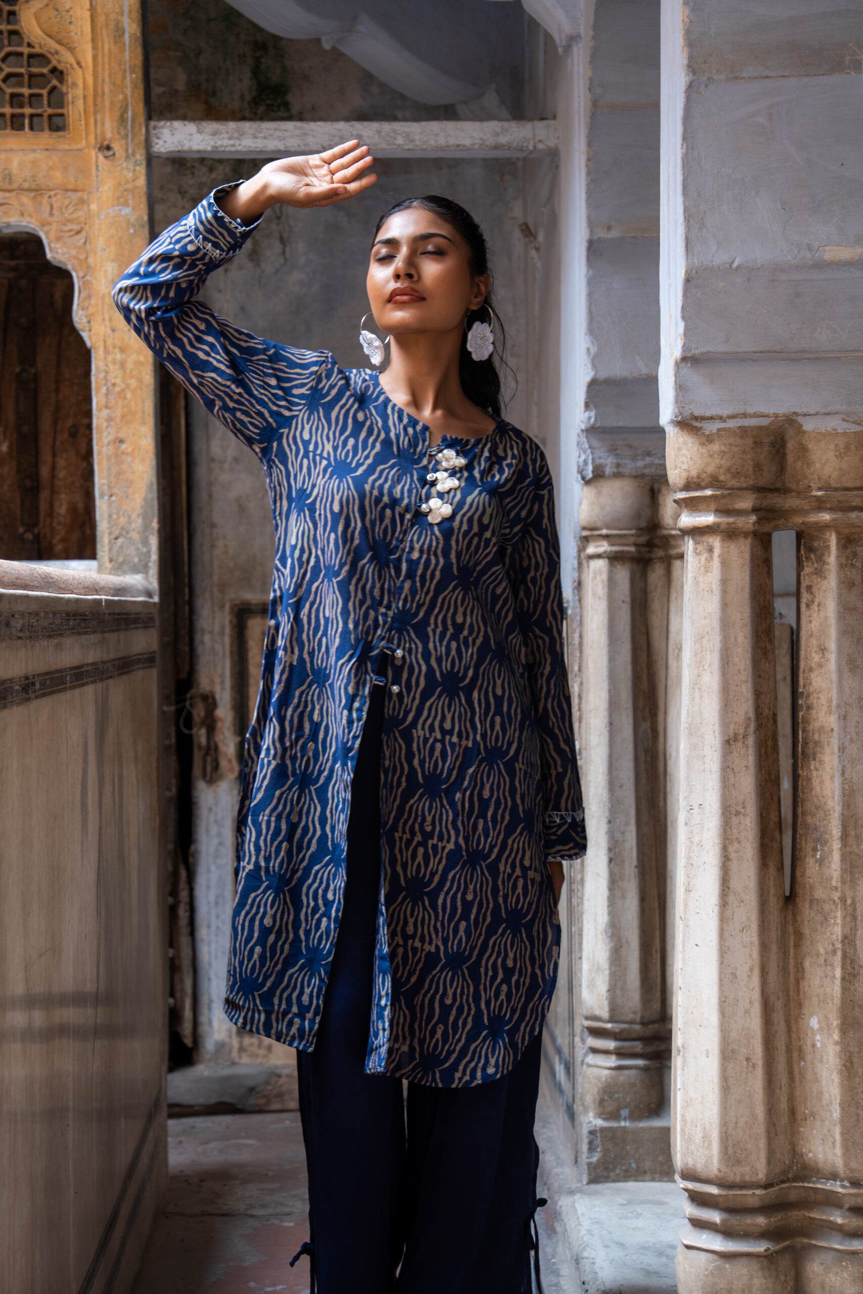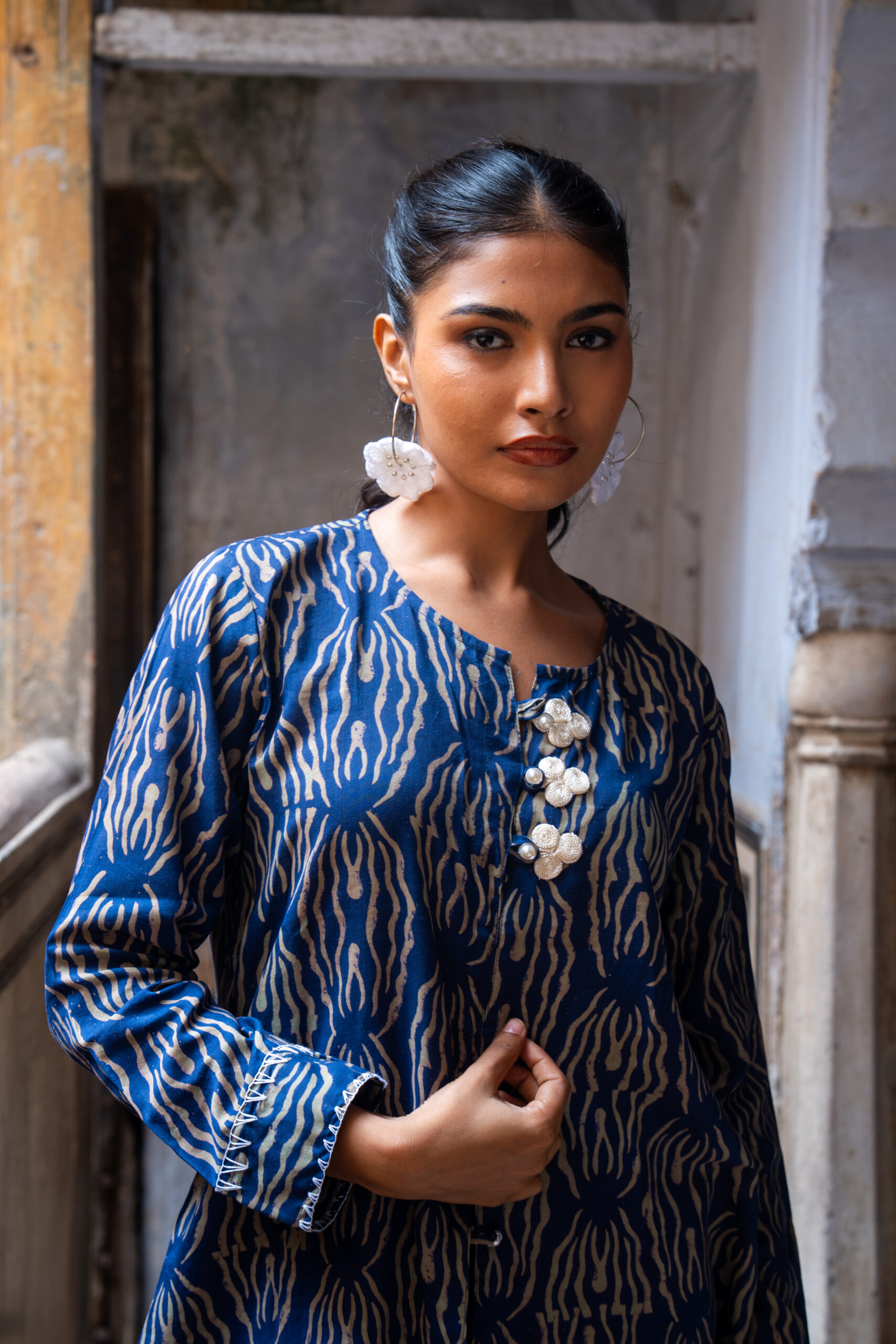 The tunic is crafted in a luxurious Cotton-silk , featuring a relaxed silhouette that flows effortlessly. The neckline is adorned with intricate floral button embellishments that adds a touch of handcrafted charm, making it as versatile for day wear as it is for intimate gatherings.