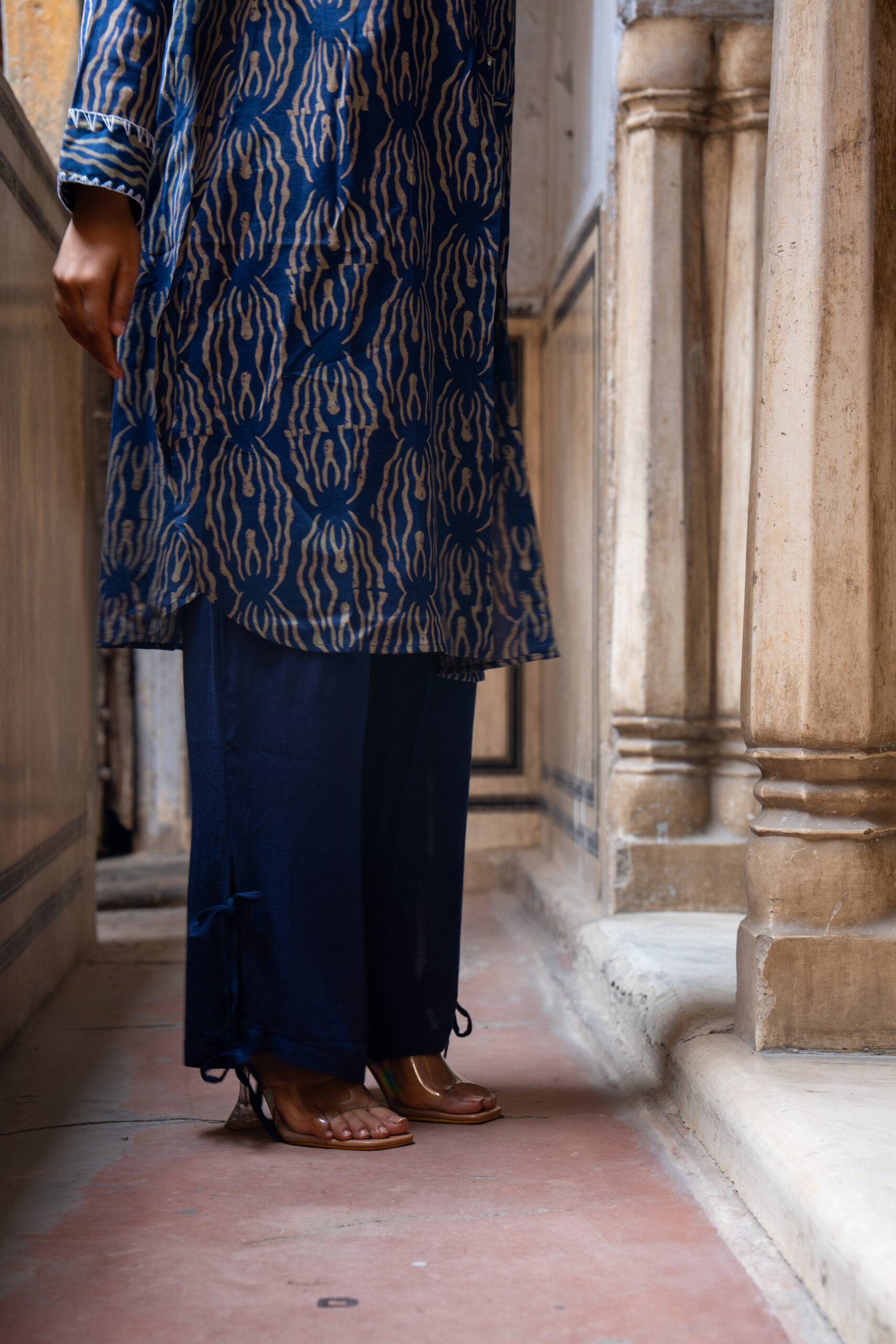 Paired with the tunic are straight-cut pants in natural crepe, designed for all-day comfort and fluidity. The highlight detail—delicate side tie-ups at the hem—lends a playful edge.