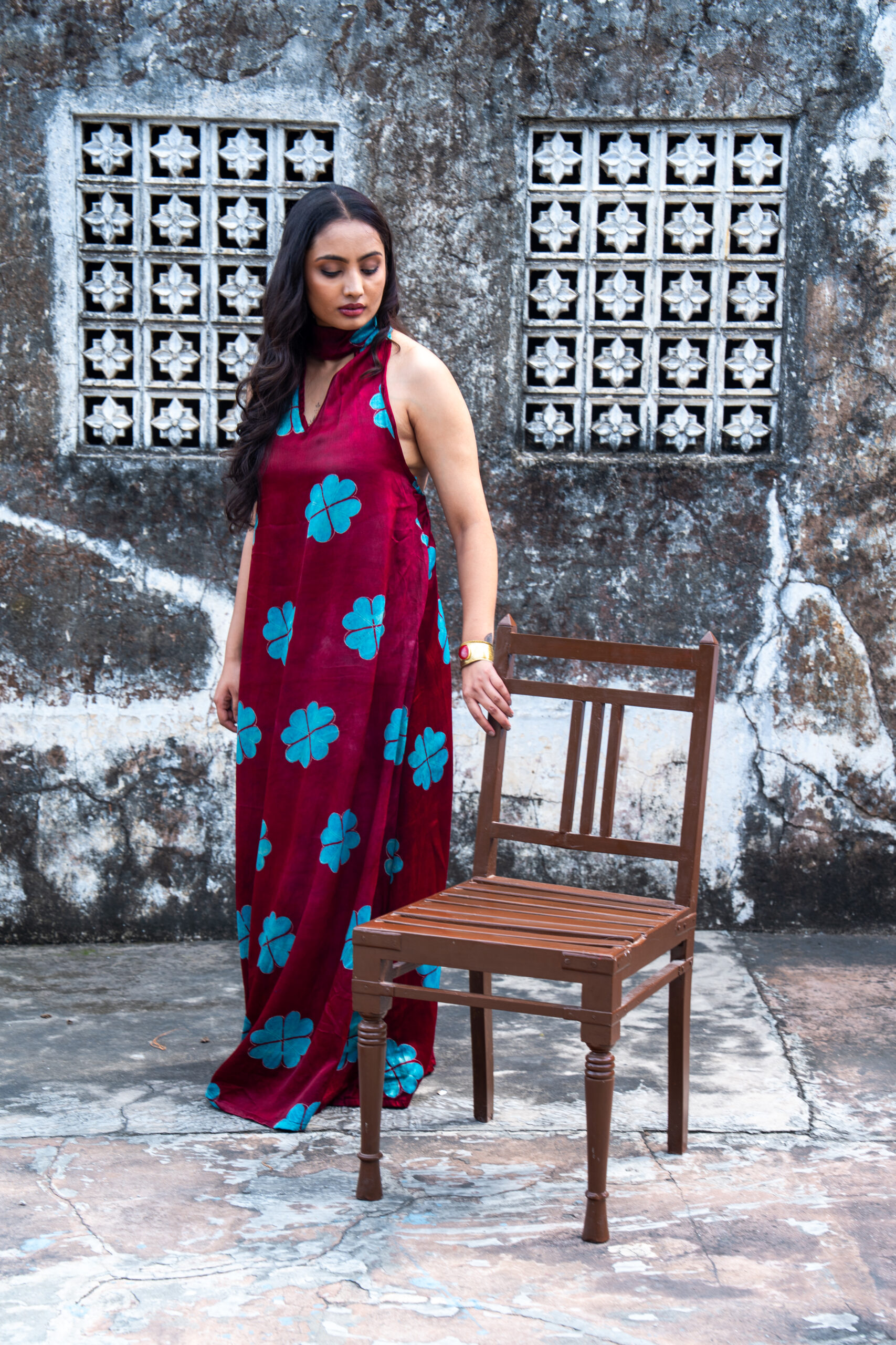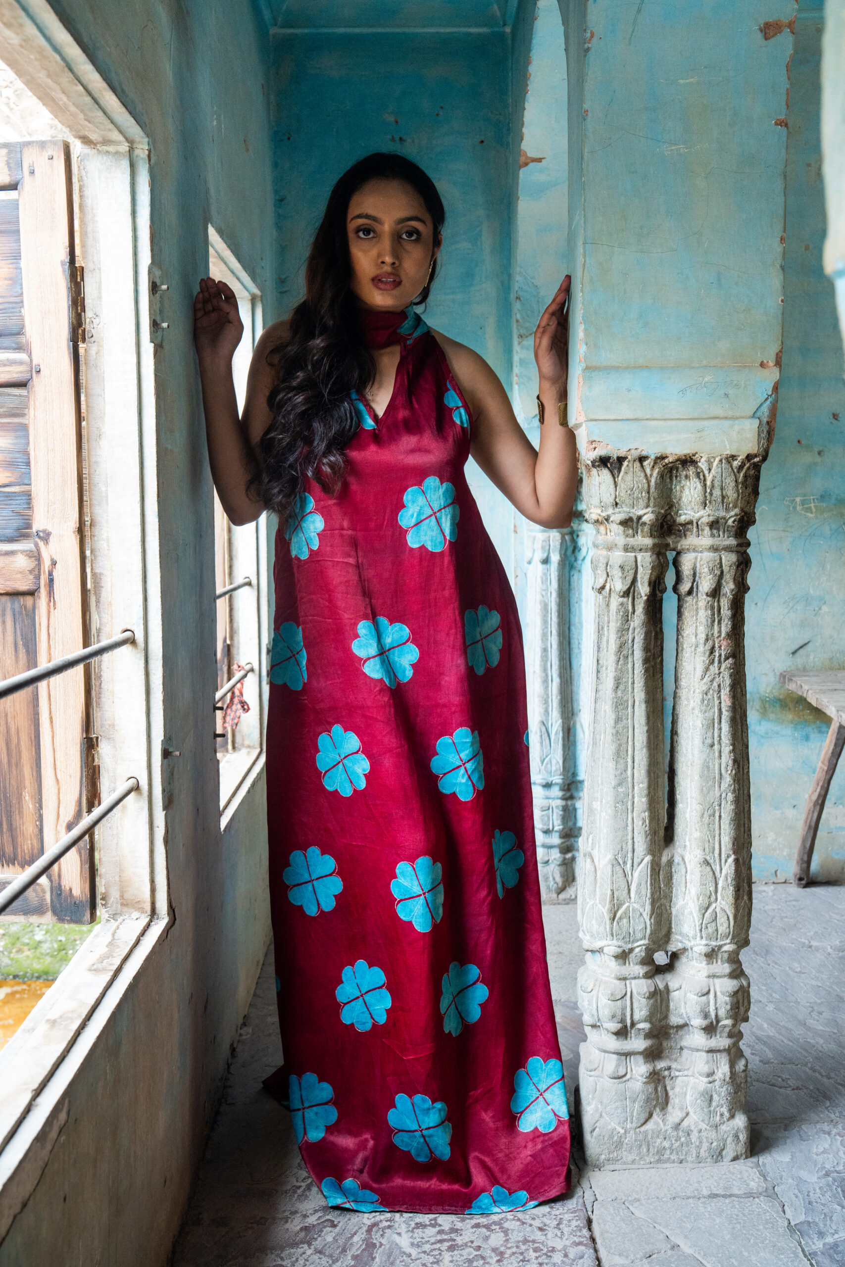 Designed with a high neck that ties gracefully into a bow, the dress flows into a fluid maxi length that makes a statement with every step. The dramatic backless detail adds allure, balancing sophistication with a daring twist.